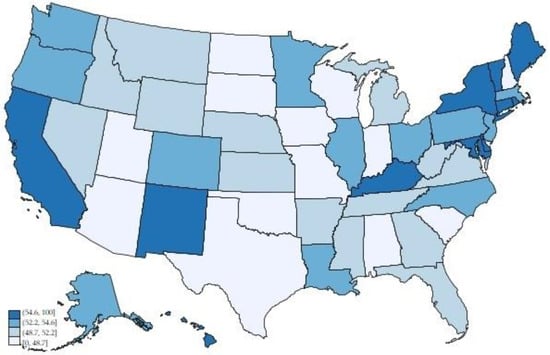 To account for COVID-19 propagation, we rely on two main variables. We identify two channels through which the virus can lead to changes in production and consumption routines and thus generate a negative economic effect. We first consider an indicator of the number of deaths attributed to the disease for every 100,000 inhabitants based on data provided by the U.S. Center for Disease Control and Prevention. These data indicate important differences by state, ranging from 22.5 (Vermont) to 205 (New Jersey) in 2020. This metric should be more reliable than the infections ratio (more prone to reflect differences by state in terms of testing strategies), although there is still the risk of some misreporting of deaths if officially recorded. The second variable specifically captures the normative channel, linked to the restrictions imposed in terms of home confinement and the closure of offices, shops, and schools, among others. This is measured as the average Stringency Index during 2020. Policy responses have varied significantly by state, from the strictest (New Mexico) to the lightest (South Dakota). Naturally, as the model will be estimated for a 2016–2020 panel, the COVID variables will take a value of zero for years before 2020 as there were no COVID deaths or lockdown restrictions imposed. Adding other policy-related variables, such as the share of vaccinated population, is not possible as our data set extends only through the end of 2020, when vaccines were not yet available (the first vaccine in the US was administered in mid-December of that year).