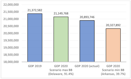 With the estimated coefficients, we can calculate the 2020 growth rate attributed exclusively to the restrictions imposed, which depends on the level of penetration, as seen above in Equation (4). With this information, we can simulate the GDP for 2020 according to two different scenarios of broadband penetration: that of the state with the highest broadband adoption (Delaware, 91.4%) and that with the lowest broadband adoption (Arkansas, 39.7%). Results are presented in Figure 3 next to the actual values for 2019 and 2020 GDP.