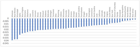 Figure 4 presents the elasticity calculations by state, using in each case their respective Stringency Index and broadband penetration. This elasticity can be thought of as a measure of how much a state’s GDP was negatively affected by an increase in the Stringency Index. The largest elasticity (in absolute terms) is that of Arkansas, where an increase in 1% in the Stringency Index reduces GDP by 0.039%. On the other end of the distribution, the states that are less sensitive to lockdown intensity are those in the Northeast (Delaware, New Jersey, Rhode Island), partially because of having greater broadband adoption.