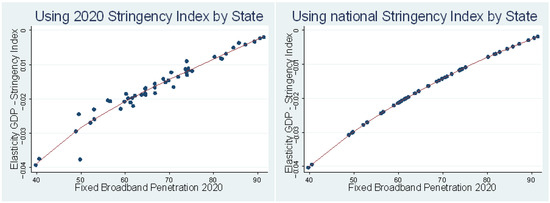 In Figure 5, we plot the elasticities by state against fixed broadband penetration levels. In the panel on the left, the elasticity calculation is plotted against the actual (real) 2020 Stringency Index by state. In the panel on the right, we replicate the calculation but leave constant the Stringency Index across states (using the national average) to isolate the specific differences in elasticity attributed to broadband penetration levels. This indicates that in states with higher broadband penetration, less economic damage occurs as a result of increasing lockdown intensity above 2020 levels.