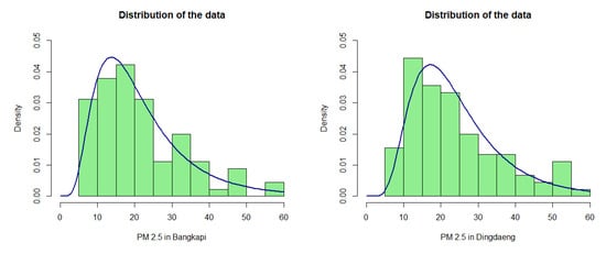 The Air Quality Index is based on measurements of particulate matter (PM), ozone, nitrogen dioxide, sulfur dioxide and carbon monoxide emissions. Most of the stations on the map are monitoring both PM2.5 and PM10 data. Air pollution, especially PM from vehicles, has a major impact on people’s health, namely those who live in urban areas and close to traffic. Singhasomboon et al. [15] studied the PM2.5 mass concentrations in Bangkapi and Dindaeng in Thailand. In this example, we will use these data sets to study the difference of the medians for PM2.5 in theses cities. Singhasomboon et al. [15]) showed that the QQ plots for these two data sets are positively skewed and the logarithmical transformed data are approximately normally distributed. Using the “fitdistr” function in the R program, we obtained the estimators of the corresponding parameters in the log-normal distributions. Furthermore, the Kolmogorov–Smirnov (K-S) test (Hassani and Silva [34]), the Anderson–Darling (A-D) goodness-of-fit test (Anderson [35]) as well as the p-value (pval) are reported in Table 6. The K-S statistic for the data from PM2.5 in Bangkapi was 0.0509, and the corresponding p-value was 0.9737. The K-S statistic for the data from PM2.5 in Dindaeng was 0.0769, and the corresponding p-value was 0.6613. Therefore, these data were reasonably fitted for the log-normal distributions. The fitting curves of the probability densities from these data sets are also displayed in Figure 1.