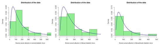 In the following, we consider another data set that has unequal and small sample sizes, which was studied by Schaarschmidt [36]. The data set can be found in the handbook written by Hand et al. [37], consisting of 57 observations of nitrogen-bound bovine serum albumin produced by three groups of diabetic mice: normal, alloxan diabetic and alloxan diabetic treated with insulin. Using the “fitdistr” function in the R program, we obtained the estimators of the corresponding parameters in the log-normal distributions. The estimators of the corresponding parameters of the log-normal distribution for each group are shown in Table 8. Similarly, the Kolmogorov–Smirnov (K-S) test, the Anderson–Darling (A-D) goodness-of-fit tests as well as the p-value (pval) are reported in Table 8. The K-S statistic for the data in the normal group was 0.1846, with a corresponding p-value of 0.5031. The K-S statistic for the data in the alloxan group was 0.1012, with a corresponding p-value of 0.9927. Finally, the K-S statistic for the data in the alloxan with insulin group was 0.0999, with a corresponding p-value 0.9913. Therefore, these data from the three groups are reasonable fits for the log-normal distributions. The corresponding fitting curves of the probability densities from these data sets are displayed in Figure 2.