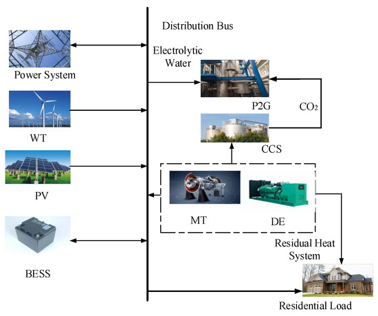 The microgrid integrating carbon capture and storage (CCS) and power to gas (P2G) is shown in Figure 1, which can be subdivided into four parts according to their functions. The energy generation unit consists of distributed generation such as wind turbine (WT), photovoltaic cell (PV), micro turbine (MT), and diesel engine (DE). The energy storage unit mainly contains a battery energy storage system (BESS), carbon capture and storage (CCS), and power to gas (P2G) systems. Load unit refers to an electrical load (Load).