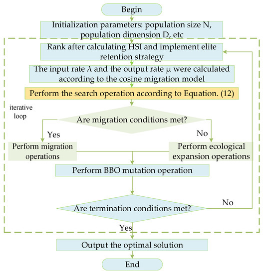 The Biogeography-Based Optimization (BBO) algorithm was first proposed by Simon in 2008, which has a simple structure, fewer parameters, and shows good optimality search ability. However, the BBO algorithm still suffers from the problems of limited search range at the beginning of the iteration and the tendency to fall into local optimization at the end of the iteration. An Improved BBO (IBBO) algorithm is proposed to address the aforementioned shortcomings, which introduces a search process and an ecological expansion operation while replacing the linear mobility model with a cosine mobility model, and its flowchart is shown in Figure 3.