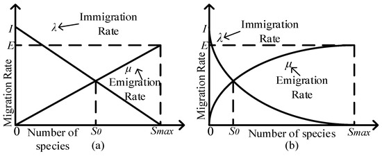 The BBO algorithm is based on a simple linear mobility model, as shown in Figure 4a below, but this model does not work for most optimization problems; thus, IBBO chooses a nonlinear migration model, namely, the cosine mobility model shown in Figure 4b below.