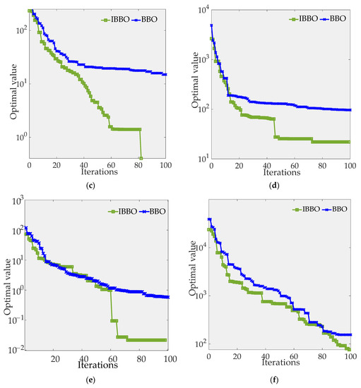 From Figure 5, it can be observed that the optimal values of each function in the initial stage of the iteration differ significantly, and the optimal value of the function obtained by the IBBO algorithm is 18, while the value obtained by BBO exceeds 20. It is more obvious for the function , where the initial solution of IBBO is 2.4 × 104, which is much better than the other algorithm. For the function –, the performance of each algorithm in the initial stage is similar. It can be seen that the IBBO algorithm can enter the working state more quickly at the beginning of the iteration, which laterally reflects that adding the search process before the migration operation can enhance the population diversity, and indicates the rationality of this improvement strategy. From the perspective of convergence speed and optimization accuracy, the convergence curve effect of IBBO is much better than that of BBO for all tested functions, indicating that the introduction of eco-expansion operation has achieved good results. Moreover, combined with the images, it is visible that IBBO shows a better evolutionary curve from the beginning of the iteration to the final end. Compared with the BBO algorithm, IBBO shows a stronger search capability in the late iteration, while BBO is caught in a local search for superiority. It can be demonstrated that the overall performance of the IBBO algorithm is better.