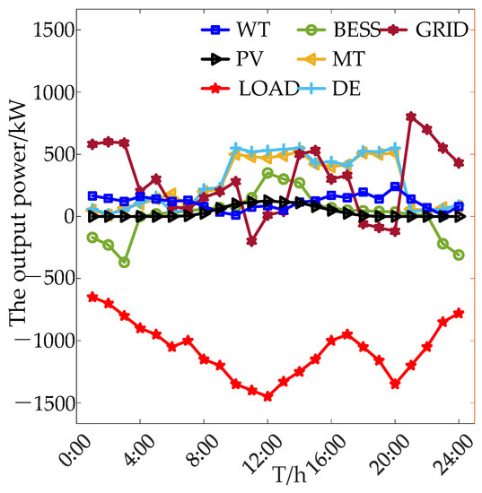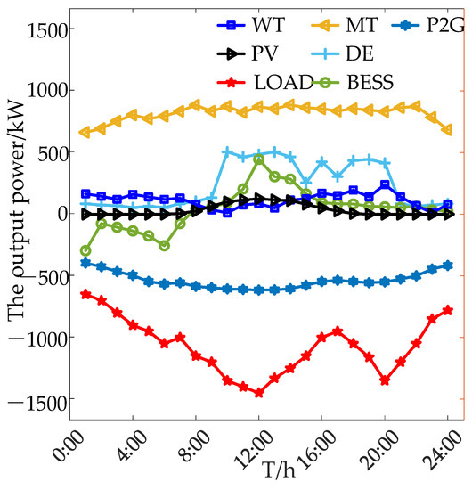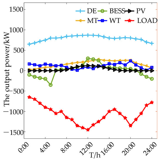 When only the single objective function with the lowest operating cost of the microgrid system is considered, the output of each installation needs to be considered in terms of the generation cost of the distributed power sources. Compared with conventional DE and MT, CCS and P2G operate at a higher cost. Therefore, their output is not considered in this scenario, and only the optimized dispatch of DE, MT, WT, PV, and BESS is considered, as demonstrated in Figure 7.