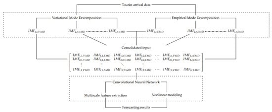 In this paper, we take VMD and EMD as two MD models and CNN as the final estimation model, and propose a new MD-CNN forecasting model. The general structure of the MD-CNN tourist arrival forecasting model is illustrated in Figure 1.