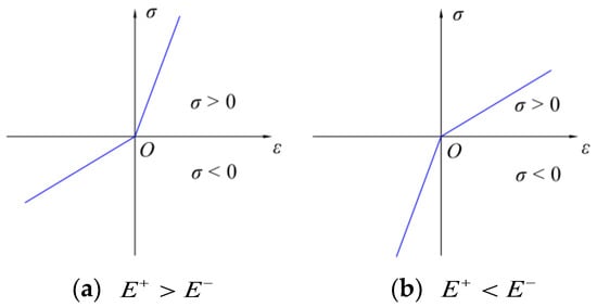 Many investigations showed that the vast majority of materials [,], such as graphite, ceramics, rubber, concrete and certain biomedical materials, have tensile and compressive strains of different magnitudes when they are subjected to tensile and compressive stresses of the same magnitude. Jones [] called these materials as bimodular materials or multimodulus materials. In the theoretical analysis of the engineering field, two material models are widely adopted. The first is the Bert model [], which is established on the criterion of positive–negative signs in strains of the longitudinal fibers. Generally, this model is used in the analysis of orthotropic materials and laminated composites [,,]. The second is the Ambartsumyan model [], which is established on the criterion of principal stress’s positive–negative signs, and this model is mainly applicable to the analysis of isotropic materials. The existing studies showed that the application of the Ambartsumyan model in structural analysis is of particular significance, because it is the judgment on principal stress that determines whether a certain point in a structure is in tension or in compression. Our study is based on the latter model on principal stress.