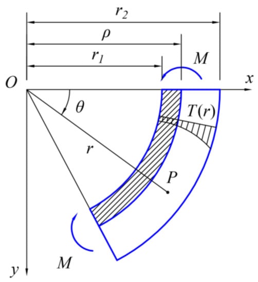 A bimodular curved beam with a certain section type and unit thickness is subjected to the bending moment, M, and the thermal load, T, and any segment in the beam is taken as a studied object, as shown in Figure 2, in which r1 represents the inner radius of the curved beam, r2 represents the outer radius, and ρ is the curvature radius of the neutral layer, which is unknown at present. For any point P of the beam, r represents its polar radius, and θ represents its polar angle, in which the positive rotation direction is specified as from the positive half x-axis to the positive half y-axis; that is, the positive rotation direction is clockwise, as shown in Figure 2. In this study, we adopt two-dimensional thermoelasticity to find thermal stresses of the bimodular curved beam under bending moment and thermal load. Under the action of external bending moment M, the curved beam further bends inward, generating an inner tensile area, as shown in the shading in Figure 2, and an outer compressive area. Our simplified mechanical model is established on the basis of a subarea in tension and compression.