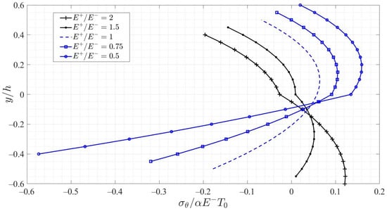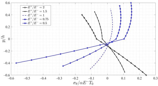 Now, we prescribe two different temperature rise modes, the linear and the non-linear, to plot the variation curves of the dimensionless thermal stress σθ/αE−T0 with y/h, under different bimodular cases, as shown in Figure 5 and Figure 6, in which the x-axis stands for the dimensionless stress σθ/αE−T0 and the y-axis for the dimensionless section height y/h. The linear and non-linear temperature rise modes are defined as, respectively,