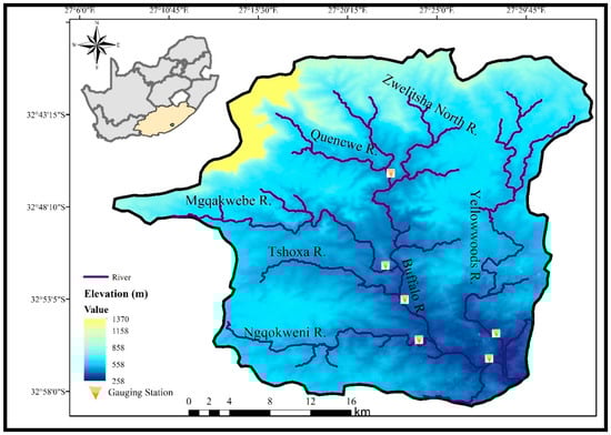 The map of the Buffalo River Basin showing the basin elevation and the six streamflow gauging stations: three stations on the main channel (Quencwe R., Tshoxa R. confluence, and the mouth before the Yellowwood R. confluence) and three stations on the tributaries (Mgqakwebe R., Ngqokweni R., and Yellowwoods R.).