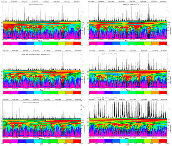 The continuous wavelet transform (CWT) of the daily streamflow series (1981–2020) of stations in the Buffalo watershed was computed for information about the local wavelet spectral signal (Figure 2). The results show that the more substantial variability lies within the 128 and 4096-day scales. In most cases, substantial variability was exhibited at the periodic scale above 4096 days to 8192 days; however, these lie within the solid bell-shaped curved padding demarcating the possible erroneous zone affected by the edge effect. The most sporadic high-power signal, suggesting correlated wet days, in Quencwe, TB, Ngqokweni, and ZB streamflow were exhibited at scale 2048 days, while Mgqakwebe and Yellowwoods’ highest power lie on scale 4096 and 768 days. The most prominent region clustering, indicating the wetness period (less randomness) and streamflow persistence occurred slightly above 256 days, approximately a year.