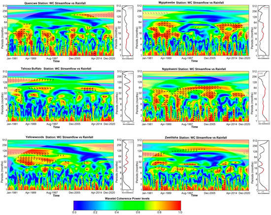 The co-movement of streamflow and rainfall within the time-frequency domain is presented using the wavelet coherence scalograms (Figure 3). In this study, the co-movement exhibited at each station and the different multiscalar levels explain the dominant phase relationship. The assessment shows that streamflow and rainfall co-movement vary in time and space within the watershed across the scale of one month to 384 months (480 months). The hydro-climatic duo is significantly correlated across the short-, mid-, and long-term scales at the 0.05 significance level. The order of streamflow–rainfall scalar variability (1–160 months) across the station, that is, the total correlation of streamflow to rainfall, is exhibited as TB > Ngqokweni > Yellowwoods > Mgqakwebe > ZB > Quencwe.
