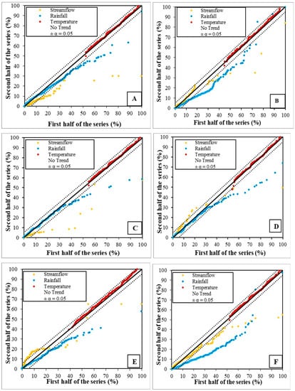 The plot of the innovative trends analysis of the Buffalo catchment rainfall (blue), streamflow (yellow), and temperature (red) dataset (1981–2020) for: (A). Quencwe station, (B). Mgqakwebe, (C). Tshoxa Buffalo station, (D). Ngqokweni station, (E). Yellowwoods station, and (F). Zwelitsha Buffalo station. The central thick line denotes the zero trend line. The dotted diagonal lines on the two sides of the zero trend line denote the significant level (α = 0.05).