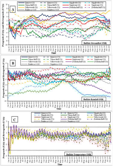 The repression provided by the increasing temperature trend, decreasing rainfall distribution, and the accentuated response of streamflow dynamic also infers the imprint of climate change in Buffalo (Figure 4 and Figure 5; Table 2) [,]. The Pettitt test noted this in the spring of 1990 for temperature and highly variable rainfall (Table 2). The consistency of temperature and inconsistency of rainfall change points as a function of local and regional differences in response to climate change has been well articulated [,,]. The periods of critical temperature increase (1982–1983, 1990, and 2011) and significant rainfall decline (1992–1996 and 2014–2020) exhibited by the SMK plots (Figure 4) conform to previous studies [,,].
