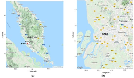 - Google Maps. 2019. Available online: https://www.google.com/maps/place/Klang,+Selangor/@3.2467558,101.2650693,9.1z/data=!4m5!3m4!1s0x31cc534c4ffe81cf:0xeb61f5772fd54514!8m2!3d3.044917!4d101.4455621 (accessed on 23 March 2019).
