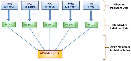 Figure 2 illustrates the process of determining the API value. On the basis of the API value, the breakpoints of 50, 100, 200, 300, 400, and 500 are referred to as thresholds for categorizing API values that correspond to their associated health status [,], as described in Table 1.