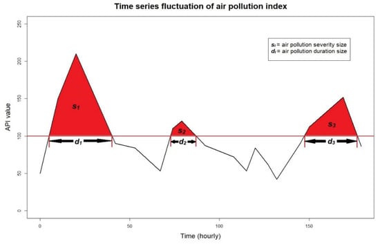 In addition, based on the duration size, this study proposes another characteristic of air pollution event, i.e., severity. Severity can be measured as cumulative API values greater than 100 that correspond to their duration . Mathematically, severity can be described as:
