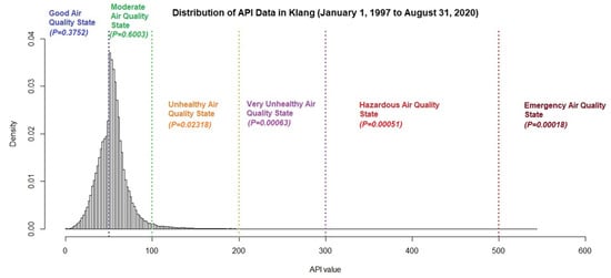 where  represents a random variable for pollution duration, j = 1, 2, 3, …, N represents an observe time series data with N is the total number of observations, and i = 1, 2, 3, …, n represents i-th air pollution event with n as the total number of air pollution events that occur throughout the period of 1 January 1997 to 31 August 2020. Then, for each particular i-th air pollution event, the indicator function  is used to represent a data points with unhealthy state (API > 100) as follows: