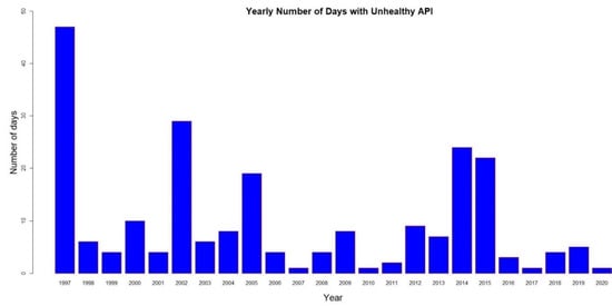 Before a detailed analysis is conducted, it is important to discuss some preliminary insights based on the descriptive statistics of the API data in Klang (presented in Table 2). Based on the observed hourly API data from January 1997 to August 2020, the mean API value is approximately 55.221 with a large standard deviation of 20.970, which indicates that the API value in Klang has high variability. The range of API values is also large, as determined by the difference between their minimum (0) and maximum (543) values. In addition, the measure of skewness and kurtosis indicates asymmetric behavior. These scenarios are presented clearly in Figure 5. The distribution of API data has a high variability accompanied with high skewness behavior due to long tail properties that exist in the upper tail of its distribution. Most of the time, the API status in Klang indicates a good (API < 50) and healthy (50 < API < 100) status. However, as mentioned previously, this study only investigates the occurrence of events above the unhealthy (API > 100) status, which could be defined as an unhealthy air pollution event. In particular, the proportion of data points (hourly) with unhealthy API is about 0.0245. That is, the total observed number of hours for unhealthy events (API > 100) from January 1997 to August 2020 is about 4980 h. In addition, Figure 6 shows the bar plot for yearly number of days with unhealthy API. Based on Figure 5 and Figure 6, the occurrences of extreme air pollution events represented by unhealthy, very unhealthy, hazardous, and emergency status is small. However, these events provide the most valuable information about the severity of a pollution event. These events exert negative effects on human health, disrupt economic activities, and deteriorate environmental ecosystems. Thus, these events are crucial for data analysis, particularly pollution risk management and mitigation.