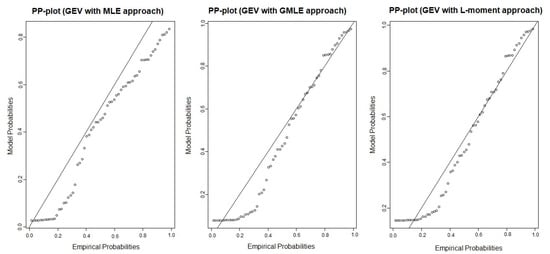 PP-plot on the fitted GEV model based on different estimation approaches.