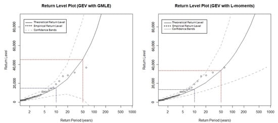 Based on the fitted GEV model, information regarding the return period and return level of the severity size can be determined to measure the risk of recurrent extreme air pollution events. Return period provides information about the estimated time interval between the re-occurrence of some particular return level [,]. In this study, a return level refers to air pollution events with a particular level of severity size. For example, if a return period of some particular air pollution event is about 10 years, then its probability of occurring is equal to 1/10 during any one monsoon season. However, it does not mean that if an air pollution event has occurred within a 10-year return period, then the next air pollution event will occur within the next 10-year period as well. To the contrary, this means that, in any given monsoon season, there is a 10% chance that an air pollution event will occur, regardless of when the last similar event occurred. Figure 9 shows the results of return level estimates based on the GMLE and L-moment approaches. Both plots show that the estimated return level curves are found to be similar within the range of the observed data. However, for the range beyond the observed data, the interpolation of severity return level indicates differences. The return level estimate for maximum severity size based on GEV modeling with GMLE is found to be increased even more in comparison with the return level estimate based on GEV modeling with the L-moment approach. The confidence intervals of GEV modeling with GMLE are found to be much wider than GEV modeling with the L-moment approach, particularly for long return periods. Given that a small uncertainty is desirable, GEV modeling with the L-moment approach could be trusted, which implies that its inferences to the data of air pollution duration would be preferred.