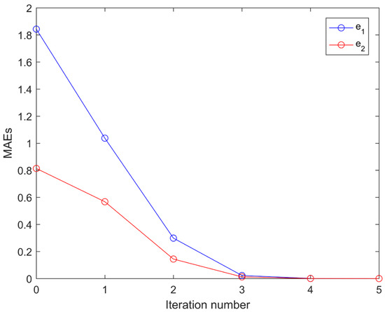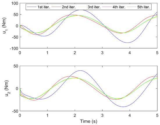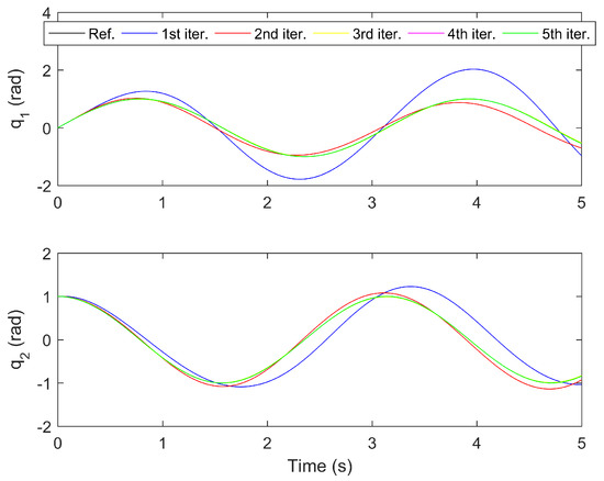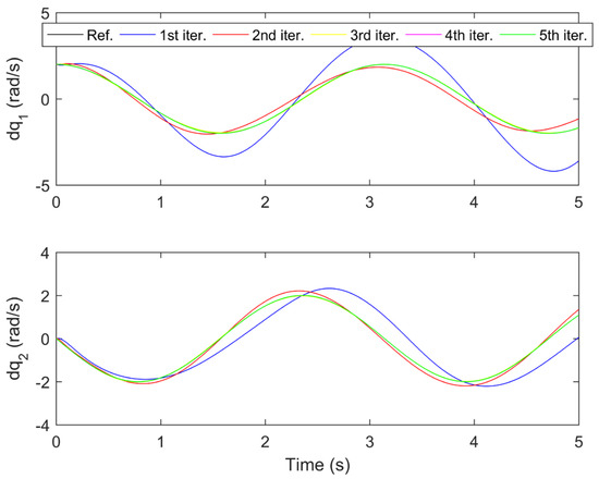 The simulation results for the proposed controller under the first five iterations are provided in Figure 3, Figure 4, Figure 5, Figure 6 and Figure 7. Figure 3 and Figure 4 show the time response of the position tracking and velocity tracking under the first five iterations. It is clearly seen that as the iteration number increases, the actual position and velocity of the robot manipulator can regulate to the desired values more accurately and rapidly. The time response of the control torques under the first five iterations is given in Figure 5. It is obvious that the control torques can always stay within the reasonable range during the whole trajectory tracking process. Figure 6 and Figure 7 present the maximum absolute errors (MAEs) of the position tracking and velocity tracking under the first five iterations. The MAEs greatly decrease for the first three iterations and then they tend to be steady. Under the fourth iteration, the MAEs of the position tracking are and , and the MAEs of the velocity tracking are and . It is noteworthy that such tracking accuracy is sufficient for the operations of industrial robots in the real world.