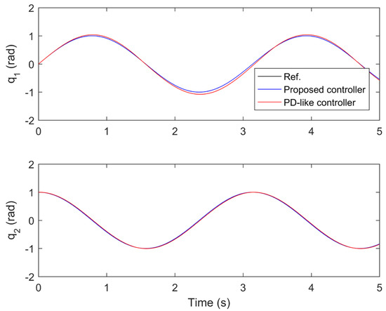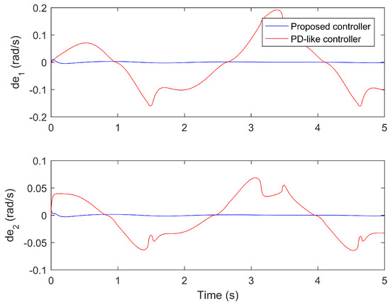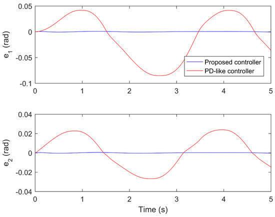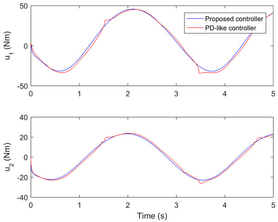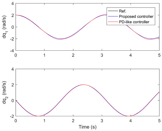 The performance comparisons between the proposed controller under the fourth iteration and the compared finite-time PD-like controller are provided in Figure 8, Figure 9, Figure 10, Figure 11 and Figure 12. Figure 8 and Figure 9 present the tine response of the position tracking and velocity tracking under both controllers. Figure 10 and Figure 11 give the tine response of the position and velocity tracking errors under both controllers. Moreover, the time responses of the control torques under both controllers are shown in Figure 12.