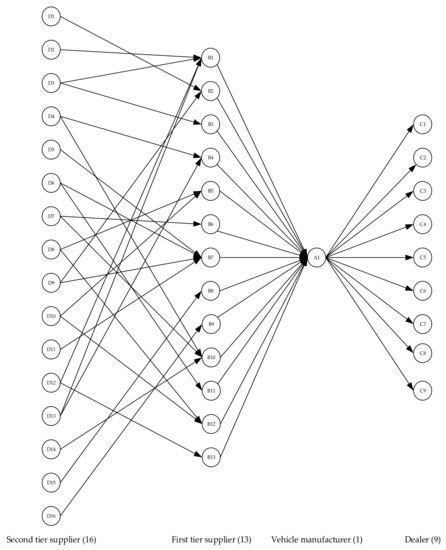 In order to ensure supplier confidentiality, the suppliers in this article are replaced by coded identifiers. Due to the supply chain network being very complex, it was difficult to obtain all the necessary supplier information. Therefore, this article builds a simplified automotive manufacturing supply chain based on the available information, which includes 13 first-tier component suppliers, which are represented by B1 to B13; 16 s-tier component suppliers, which are represented by D1 to D16, and 9 dealers, which are represented by C1 to C9, where 1 automotive manufacturer is represented by A1. The supply–demand relationship of each node in the supply chain is shown in Figure 2. The arrows in the figure only indicate the direction of product flow, not the direction of risk propagation.