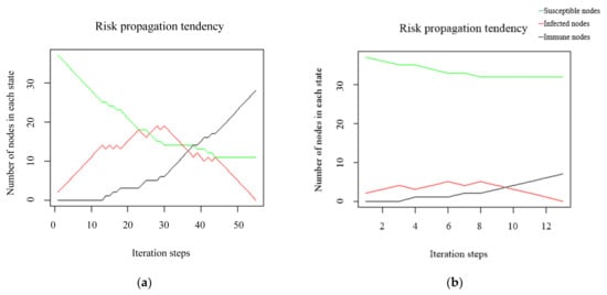Comparison of inoculation effect: (a) risk propagation trend without immunity strategy; (b) risk propagation trend with target immunity strategy.
