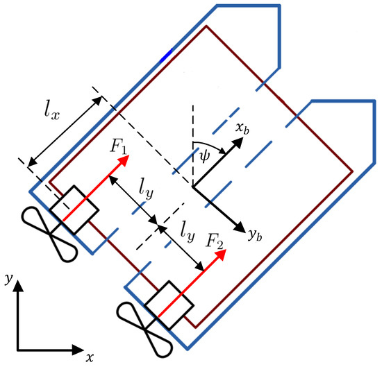 The translational velocities, expressed in the body-fixed frame in surge and sway, and the rate of rotation in yaw, are expressed by the velocity vector , which represents the velocities (surge and sway velocities and yaw rate) in the three DOF of the system dynamics. The corresponding coordinate systems are shown in Figure 1. The forces in and directions and the moment with respect to the yaw axis provided by the actuators are combined in .