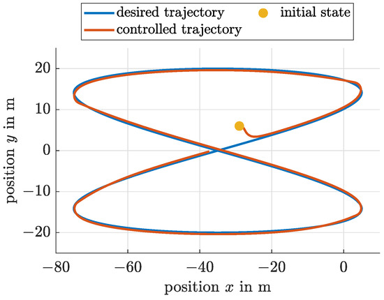 The tracking controller based on an artificial potential field approach [28,29,30] was taken from [31]. The approach is described below for completeness. In general, the artificial potential field method has its foundations in the area of robotics. There, it was originally developed as a tool for path and motion planning. In the artificial potential field approach, attracting potentials are introduced for the target states to be reached, and repelling potentials are employed to avoid collisions with obstacles. The references mentioned above represent generalizations of this approach for control purposes, especially with respect to the definition of an attracting potential for the desired trajectory that is to be tracked by the controller.