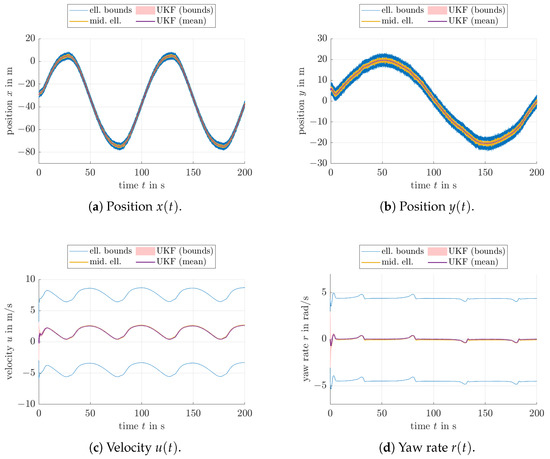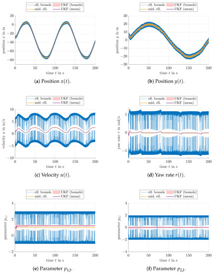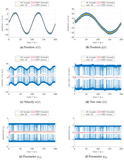 In addition, the scaling factor r representing the minimum coverage of the expected state according to [23] was varied in all depicted simulations. The first simulation in Figure 3 assumed constant bounds for the uncertain system parameters that are introduced by means of the integrator disturbance models mentioned above and in Equation (14), and the UKF simultaneously estimated these values at run-time. The interior of the non-rescaled ellipsoids with leads to a confidence level of due to the state dimension ; cf. [40].