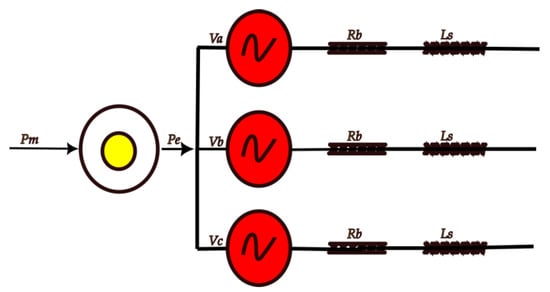 Synchronous machines are an important source of energy in electrical power networks and are frequently used as generators. The rotor and stator are the machine’s main mechanical parts. Additionally, the machine’s magnetic fields and currents interact to create a torque that slows down the rotor. A generator or a motor is created as a result of these two processes which convert mechanical energy to electromagnetic energy. At a steady state the rotor speed is proportional to the frequency of voltages and currents in the stator [23]. Power systems have used synchronous machines widely; they serve as both the main power generators in large conventional power plants and the remote stand-alone systems. Several new types of synchronous generators, including multi-pole machines for wind power conversion systems, are being developed for rapidly emerging renewable and distributed generation (DG) systems. With the aid of this equipment, a high efficiency, dependable power system with good power quality can be achieved [24]. The mathematical formulas are given below.