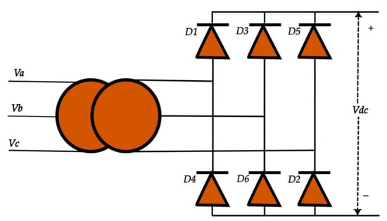 A voltage source is necessary for the standard line commutated converter of the diode valves to verify commutation. Commutation, with relation to the diode valve, is the transfer of current from one phase to another. The Graetz Bridge serves as the cornerstone for the three phases. The current Id passes through the diodes of D1, D3, and D5 (at the up group) and D2, D4, and D6 (at the down group) throughout execution [26]. One diode to the next will naturally experience current flow. The diagram of the three phase 6 pulse bridge rectifier is shown in Figure 3. Let us consider that the rectifier is provided from a three-phase voltage system. The mathematical formula is expressed as given in the equation