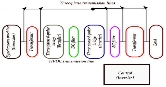 The inverter end parameters of the load are: nominal phase to phase (L-L) voltage = 440 V; nominal frequency = 50 Hz; Active power = 5 × 103 W. The model for the HVDC monopolar system is as shown in Figure 4.