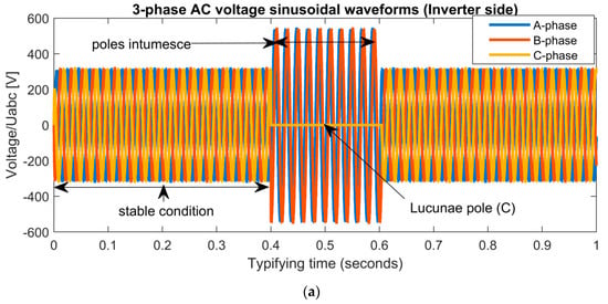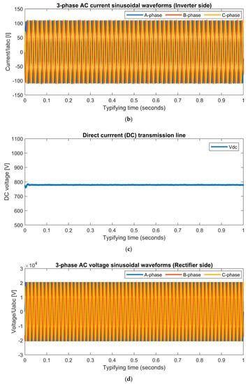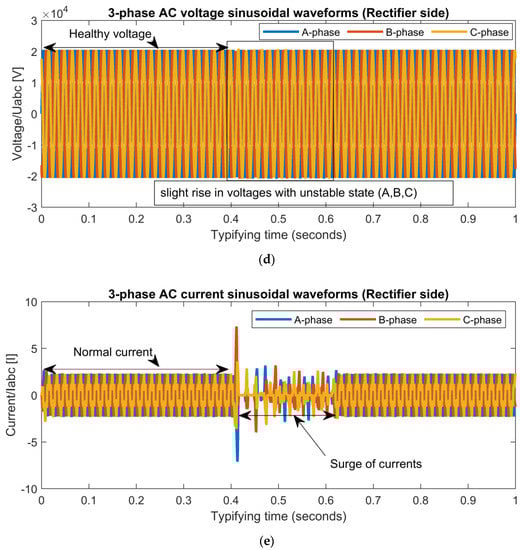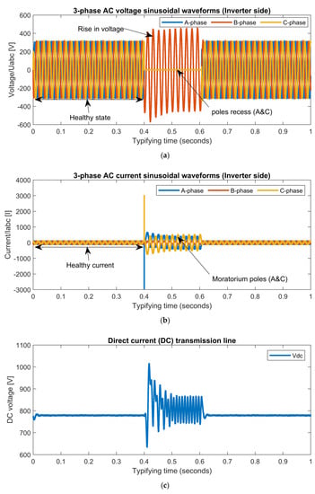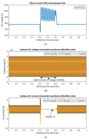 When a three phase-to-ground (LLLG) fault develops on the receiving end of the load at 0.2 s, the AC grid voltages of phase A, phase B, and phase C will reduce to zero. This is shown in Figure 5a. It will also be observed that the magnitude of the AC grid currents will show rise in sinusoidal waveforms higher than the normal values shown in Figure 5b. The DC line voltage will rapidly increase, resulting in an oscillation waveform shown in Figure 5c. During the fault, the rectifier end, the AC grid voltages will result in a slight increase in magnitude, which is shown in Figure 5d, while the magnitude of the AC grid currents of phase A, phase B, and phase C will result in zero values, shown in Figure 5e. After the fault, the system will return to the normal state of 0.62 s. At 0.2 s, the double phase-to-ground (LLG) fault will occur at the receiving end of the load. The AC grid voltages of phase A and phase C will rapidly drop to zero while the phase B will experience an increase in voltage shown in Figure 6a, and the AC currents of pole A and pole C will result in a rise in magnitude which is higher than the original values; but the phase B will maintain a steady state waveform, and this is shown in Figure 6b. The DC line voltage will show a false waveform shown in Figure 6c. At the sending end, AC grid voltages will have slight increase in values with slight disturbances and the AC grid currents will have clear results of different distortions which are shown in Figure 6d,e. At the inverter end of the load, a single line-to-ground (LG) fault occurs. The voltage magnitude of pole C will collapse to zero at 0.2 s (0.4–0.6) while the other poles of A & B will shoot up in voltages shown in Figure 7a and the current of phase A, phase B, and phase C will appear to be normal as shown in Figure 7b. The DC voltage will maintain a stable state which is shown in Figure 7c. At the rectifier end of the source, the AC voltages and currents will display normal standard values which are shown in Figure 7d,e. After the fault of 0.2 s, the system will become balanced.