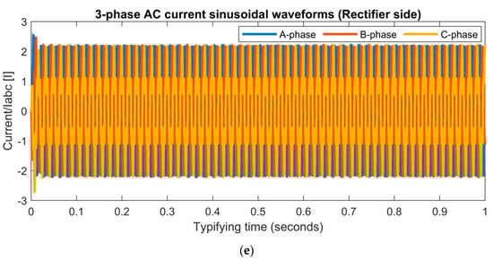 Simulation findings for the HVDC system were achieved during a single phase-to-ground (LG) fault. (a) Three-phase AC voltages at the inverter side. (b) Three-phase AC currents at the inverter side. (c) DC line voltage. (d) Three-phase AC voltages at the rectifier side. (e) Three-phase AC currents at the rectifier side.
