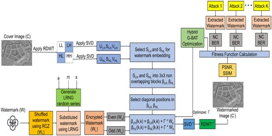 A cover image (C) of size and a binary watermark (W) of size are considered in the suggested scheme. First, 1-level RDWT is applied on C to decompose it into four sub-bands: LL, LH, HL and HH. Sub-bands LH and HL are chosen for watermark embedding, as they undergo less distortions due to embedding than LL and HH. Since RDWT is shift invariant and avoids downsampling in its sub-bands, each sub-band is of the same size as C. RDWT is more reliable in conveying watermarks with a high embedding capacity by this property. However, it is more vulnerable to noise and filtering attacks. To mitigate this pitfall, the proposed scheme employs a hybrid RDWT-SVD algorithm. SVD is applied on LH and HL, which decomposes into , , , , and sub-matrices, respectively. and represent the column and row orthogonal matrices; and represents singular diagonal matrices. Since the tiny fluctuation in singular values is unlikely to impact the image’s visual perception, the watermark is embedded by altering these singular values that show high robustness. Therefore, and matrices are selected and partitioned into non-overlapping blocks (, ) for embedding. To ensure high imperceptibility and robustness, it uses an optimized scaling factor (); an encrypted even () and odd () watermark are embedded using Equations (1) and (2) into diagonal positions of and , respectively. The process of watermark encryption as elucidated in Section 3.3 and scaling factor optimization using G-BAT is described in Section 3.4. Finally, inverse SVD and RDWT are applied to get watermarked image ().
