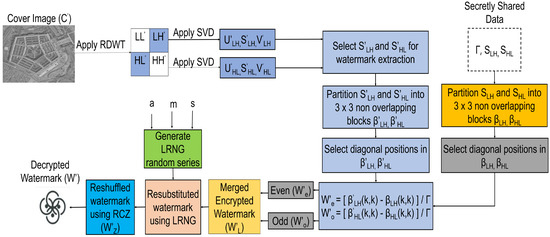 The block diagram for watermark extraction and decryption is shown in Figure 3. The extracted and are decrypted using a decryption approach, as explained in Section 3.3.2, to obtain the watermark image (). The following subsections describe the watermark encryption and decryption process.