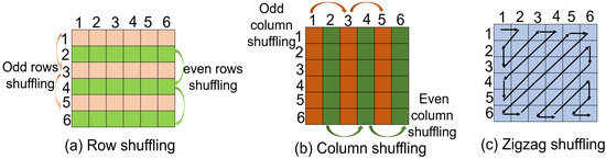 Initially, in row shuffling, even rows, i.e., row ith, are shuffled into row th, as shown in Figure 4a. Furthermore, similarly, odd rows, i.e., row ith, are shuffled into row th to get . Similarly, in column shuffling, odd and even columns are shuffled into ; i.e., column jth is shuffled into column th, as shown in Figure 4b, to get . In zigzag shuffling, shuffling starts from the position pixel in the upper left corner of the image and traverses the zigzag path at , as shown in Figure 4c. The pixels that have been traversed are stored in the one-dimensional array, which is then converted to the 2D array for a mixed watermark (). Furthermore, is substituted using a binary random key () generated from LRNG.