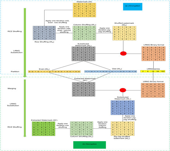The process of watermark encryption is elucidated with an example in Figure 5a. The process of watermark decryption is explained in the next sub-section.