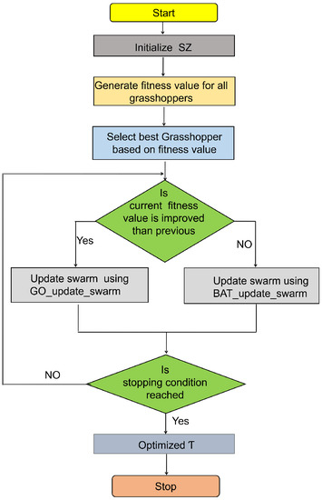 The grasshopper optimization (GO) algorithm is a simple and fast swarm intelligence-based NIO algorithm that mimics the behavior of grasshoppers [25]. In terms of search behavior, GO strikes a good balance between exploration and exploitation, and also avoids getting stuck in local optima. As well as its advantages, it also has some limitations: grasshoppers reach their comfort zones faster, but the swarm does not join a key point, which results in low search accuracy and premature convergence [26]. To address the shortcomings of the GO algorithm and improve convergence rates and search accuracy, the proposed scheme integrates GO with the BAT algorithm. BAT is also a swarm intelligence optimization algorithm based on NIO [27]. The unique feature of the BAT algorithm is that it balances exploration and exploitation behavior through echolocation frequency tuning control and auto-zoom capability. It also has the advantage of requiring parameter control rather than the fixed and preset algorithmic dependent parameters used by many NIO algorithms, allowing automatic switching from exploration to exploitation to reach the optimal solution. Table 1 shows the basic parameters for the optimization of the hybrid G-BAT [28], and Figure 6 shows the flowchart representation for the hybrid G-BAT.