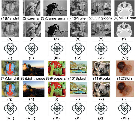 Gray-scale cover images (1–6) with corresponding watermark images (a–f) and extracted watermark images (I–VI). Color cover images (7–12) with corresponding watermark images (g–l) and extracted watermark images (VII–XII) under zero attacks.