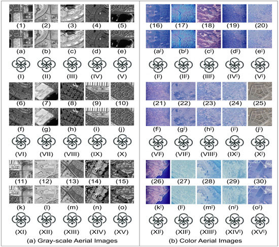 Aerial images (gray-scale images (1–15), color images (16–30)) with corresponding watermarked images (gray-scale watermarked images (a–o), color watermarked images (a–o)) and extracted watermark images (I–XV,I–XV).