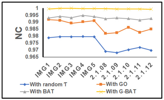 In addition, the robustness performance of the proposed scheme (under zero attack) was analyzed for the general images shown in Figure 7 and the corresponding NC. The BER is tabulated in Table 4 with random , and with optimized using GO, BAT and hybrid G-BAT. In Table 4 it can be seen that, with random = 0.9 NC for all gray-scale and color images, the threshold value is above 0.7 [31], and the BER is less than the threshold value 0.5. To improve the robustness of the proposed scheme, the optimized was built using GO, BAT and NC. The BER values are tabulated in Table 4. With the use of GO, the robustness of BAT was improved over the random . For all gray-scale and color images, NC and BER with hybrid G-BAT are almost equal to the ideal value(s) of 1.0. As can be seen in Table 4, the proposed hybrid G-BAT improved the robustness performance (under zero attack) for gray-scale and color images from 0.92 to 0.99 and from 0.91 to 0.99, respectively. As can be seen in Table 2 and Table 3, using optimized shows a lower value PSNR than using random , and keeps PSNR higher than threshold value 37 dB and the corresponding NC. BER reached the ideal value (1.0), as shown in Table 3 and Table 4. Numerical comparisons of NC and BER for the 10 test aerial RS images with random and optimized are shown in Figure 9 and Figure 10, respectively. It can be seen that the hybrid G-BAT demonstrates greater robustness than the other optimized . Thus, as revealed in Table 2, Table 3 and Table 4 and Figure 9 and Figure 10, the hybrid G-BAT approach balances the trade-offs in the characteristics of DIW (i.e., imperceptibility and robustness).