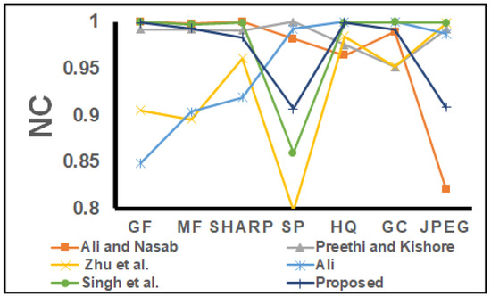 In Figure 13, it can be seen that the proposed method shows greater robustness when considering filter attacks (GF, MF, and SHARP) than the schemes in [16,17]. Additionally, it shows robustness performance almost equal to those of the schemes proposed in [14,15,18]. For JPEG attack, the proposed scheme had better performance than the schemes of [14], but lagged in comparison to the schemes presented in [15,16,17]. However, the proposed scheme had an NC ≈ 0.92, indicating higher robustness against JPEG attack. For noise attacks, the proposed scheme showed greater robustness than the schemes proposed in [16,18] and was almost equally robust as the schemes proposed in [14,15,17]. The proposed scheme showed limited performance against noise attacks, which can be seen as future work. For HQ and GC attacks, the proposed scheme is superior to the schemes in [14,15,16,18]. The comparative analysis revealed that the proposed scheme reports higher than or the same robustness as the other schemes. Furthermore, it revealed high imperceptibility, embedding ability and security compared to the other schemes ([14,15,16,17]).