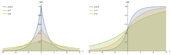 (Left) The PDFs of the Laplace distribution by varying the scale parameter. (Right) The CDFs of the Laplace distribution by varying the scale parameter.