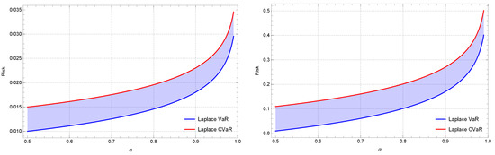 Laplace VaR and CVaR by varying the predetermined confidence level for and and on the left and right, respectively.